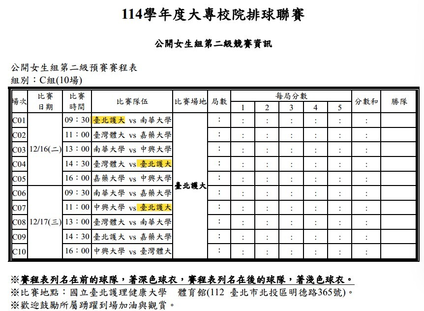 | 114學年大專排球聯賽預賽-公開女二級C組 | 114年12月16日至17日 09:00-18:00 | 北護 |
