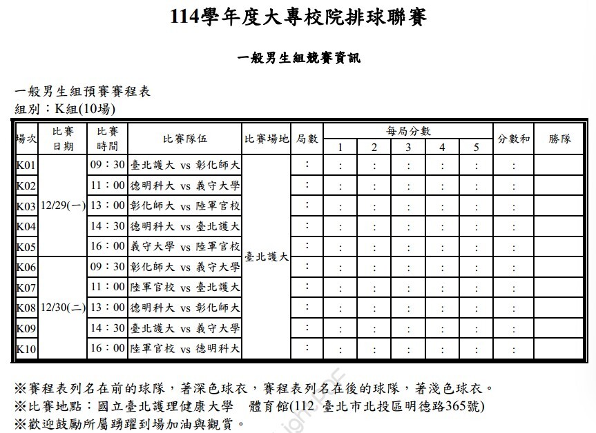 | 114學年大專排球聯賽預賽-一般男生K組 | 114年12月29日至30日 09:00-18:00 | 北護 |