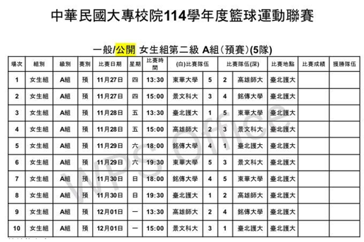 | 114學年大專籃球聯賽預賽-公開女二級A組 | 114年11月27日至12月1日 13:30-16:30 | 北護 |