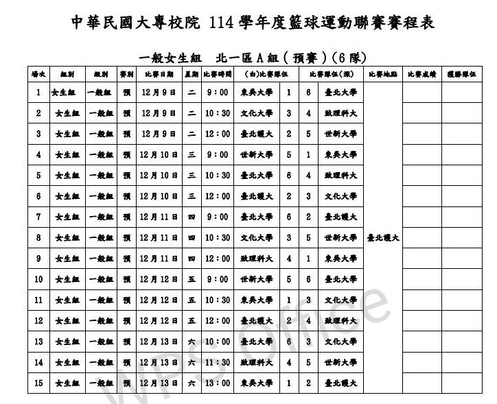 | 114學年大專籃球聯賽預賽-一般女北一區A組 | 114年12月9日至13日 09:00-13:30 | 北護 |