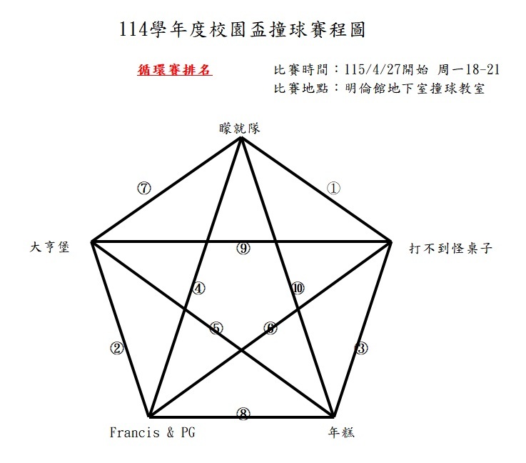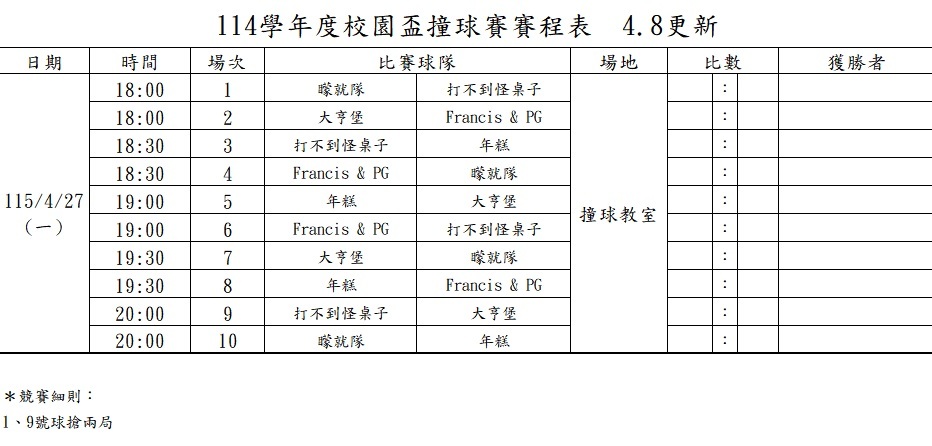 114學年度校園盃錦標賽撞球賽程公告 4.8更新